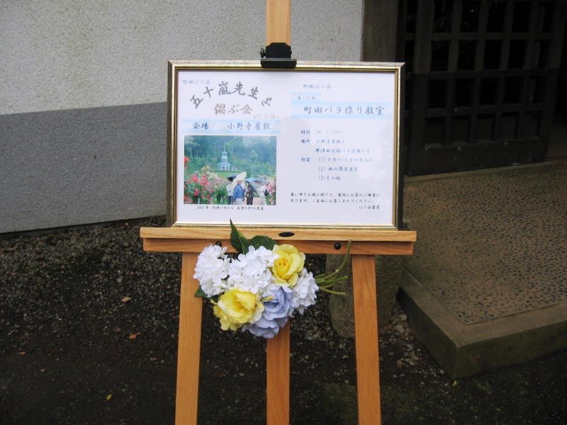 野津田公園小野路屋敷で行われた第118回町田ばら作り教室の資料およびその入り口に飾られた五十嵐先生を偲ぶ会(一周忌)のスナップです。