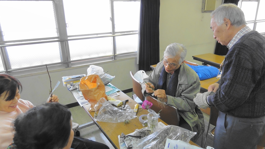 せりがや会館4F第一会議室にて切接ぎ実習が行われました。はじめに小林博夫(竹名:博憧)さんによる新年の尺八演奏が行われ、続いて岡田さんによる会計報告、切接ぎのための事前講習、そして実習と多彩な内容で今年の幕が開きました。