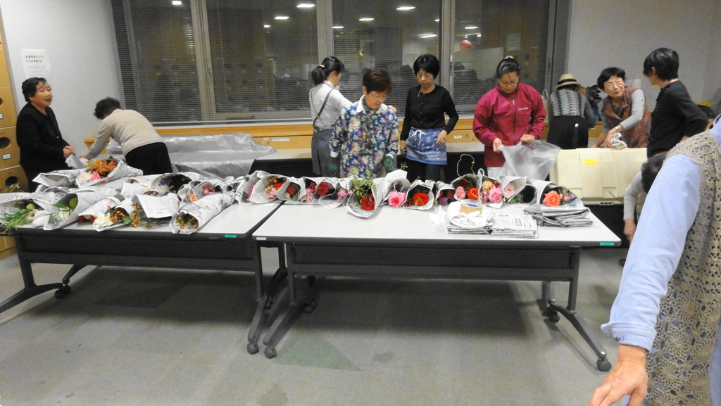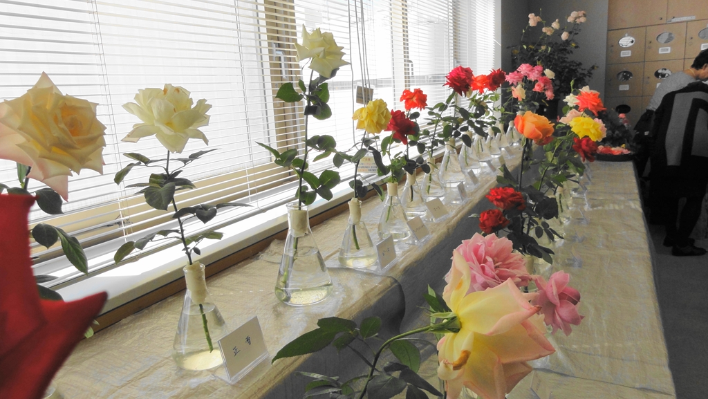 2013年10月25〜27日、町田市「第2回生涯学習センターまつり」の一環としてばら展を開催いたしました。実施場所は例年通り町田109ビルで行われ、ばらの展示スペースは従来の6階団体活動コーナーと変わりません。ただ、昨年は少しゆったりとした展示スペースが確保できましたが、今年は他の展示グループが一部使用することになりスペースが少し縮小されました。それでも展示花の質と量は昨年を上回る勢いで、にぎやかな展示会に仕上げることができました。今回も会員募集を積極的に行い、新たに会員募集用カラーパンフレットも配布し、新しい仲間の参加が期待できそうです。