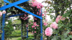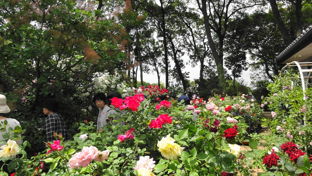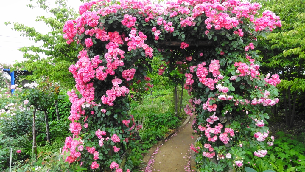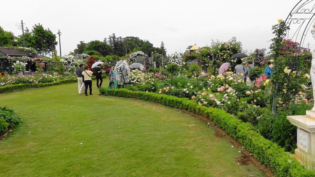 こちらも個人宅ですが、900坪近い庭をヨーロッパ風に仕立てオブジェを配置し、シンメトリーとはいかなくてもどことなく和洋折衷な庭園づくりを感じさせます。バックヤードともいえる畑に植わったばらまでシームレスに見学できるため、公共ばら園とは違った「個人宅」を意識させる個性あふれる庭といったところです。