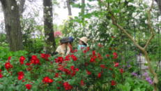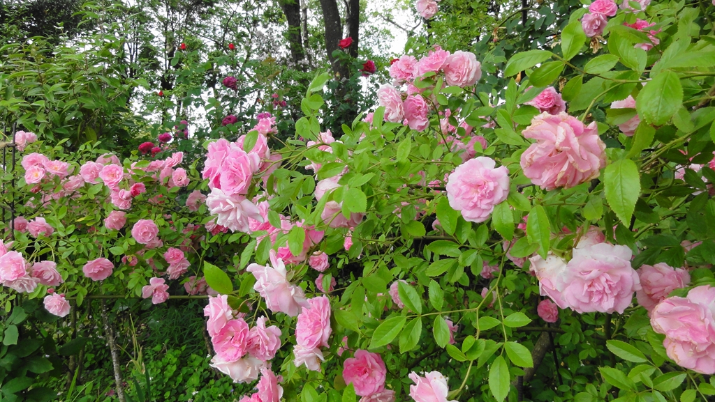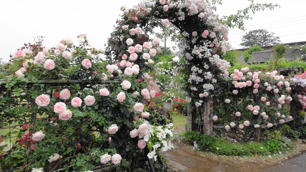 坂野家住宅は500年続く旧家でかやぶき屋根づくり、国の重要文化財にも指定されています。1000坪ほどのお庭には500種1000株のばらとディジー、アグロステンマ、ポピーなどの野草をからめて、土地の傾斜をうまく利用して絶妙に配置され、個人宅のレベルを超えた一大庭園となっています。でも、このばら園、元宝塚ジェンヌの奥様がほぼお一人で作られたということですからさらに驚きです。