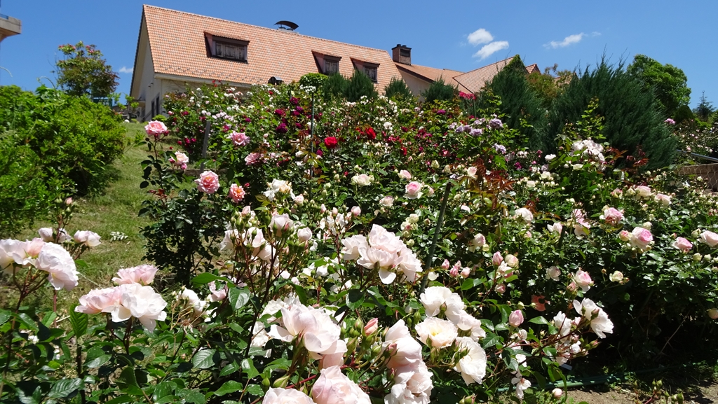 1点目は【ウインチェスターキャシードラル】英1988年ディビット・オースチン作Erです。花は、白が基本ですが、写真のように時折ピンクの斑が入ります。はちみつとアーモンドの花を感じさせる強いオールドローズの香りを放ちます。名前の由来はイギリスの有名な大聖堂「ウィンチェスター大聖堂」から付けられました。香りだけでなく、花つきも良く、花壇、ボーダー、生け垣などに向いているといわれ育てやすいばらの一つです。