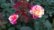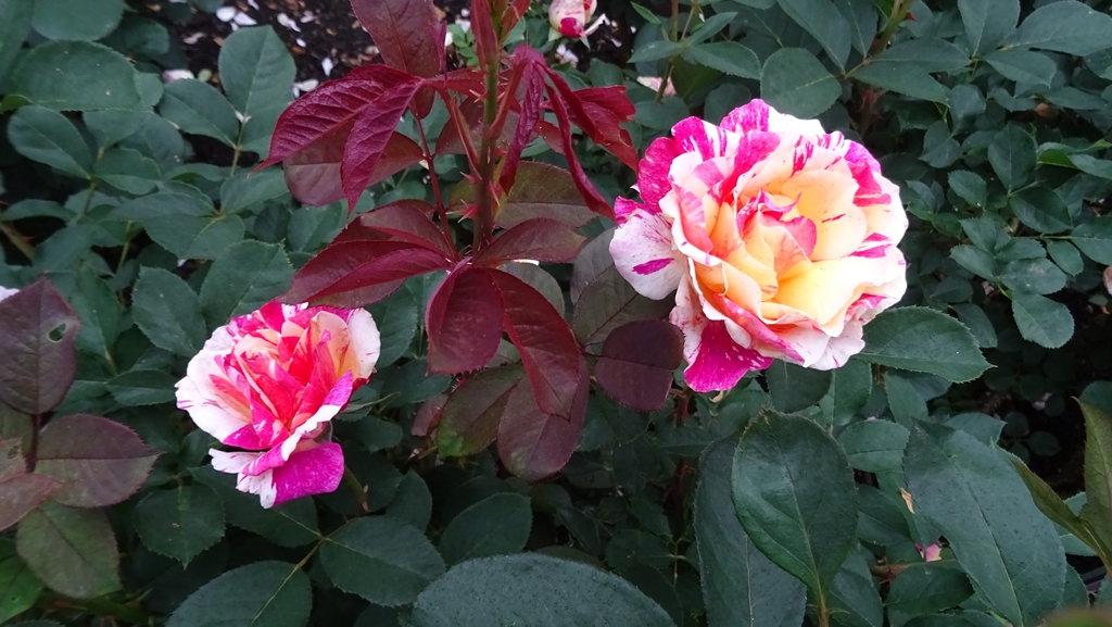 5点目は【ニュー・イマジン】仏2004年ドリュ作(日本デビュ2013年)シュラブ系に分類されます。ドリュー社はフランス南西部の村に拠点を置き、ヨーロッパ各地で支持を受けており、日本には2012年デビューしています。花は、少し小ぶりの丸弁で、紫と白色の絞り模様で複雑な絞りの入り方を示し、落ち着いた感じで表情豊かに咲きます。また生育旺盛なので、つる仕立てにも良さそうです。香りはスパイシー系の香りを放ちます。