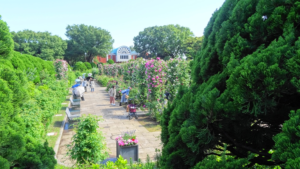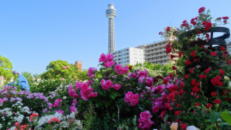 5/10(木)、横浜山下公園内にある「未来のバラ園」は昼近くまで予想外の本降りの雨でどうなることかと思っていたところ、午後から急速に晴れ間が広がり3時間ほど快晴の天気となりました。雨に打たれたせいかばらは全体的に下を向いていましたが、それでも真っ青な空と満開のばらのコラボは見ごたえがあります。プロの庭師が花がら剪定を行っており、週末が最高のお花日和になることは間違いないと思います。