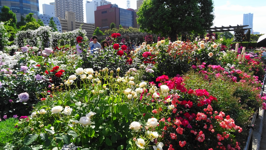 5/12(土)、横浜山下公園内にある「未来のバラ園」は気温がどんどん上昇し、昼ごろには30℃に届こうかという暑さでしたがばらはほぼ完ぺきな満開状態で楽しめました。